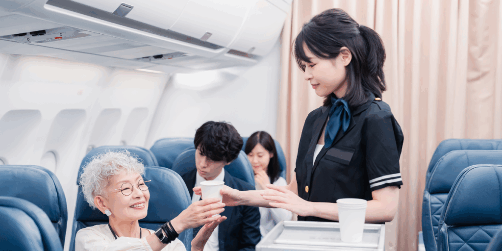 航空機の客室で機内サービスや保安業務を行う仕事です。機内食や飲み物の提供、機内販売、非常用設備の案内、離着陸前の安全確認などを行います。外国人のお客様への対応など英語力が必要とされる場面も多い仕事です。また、海外の航空会社や国内航空会社の国際線では外国人乗務員が多い場合もあり、通常の会話や業務連絡が英語で行われることもあります。